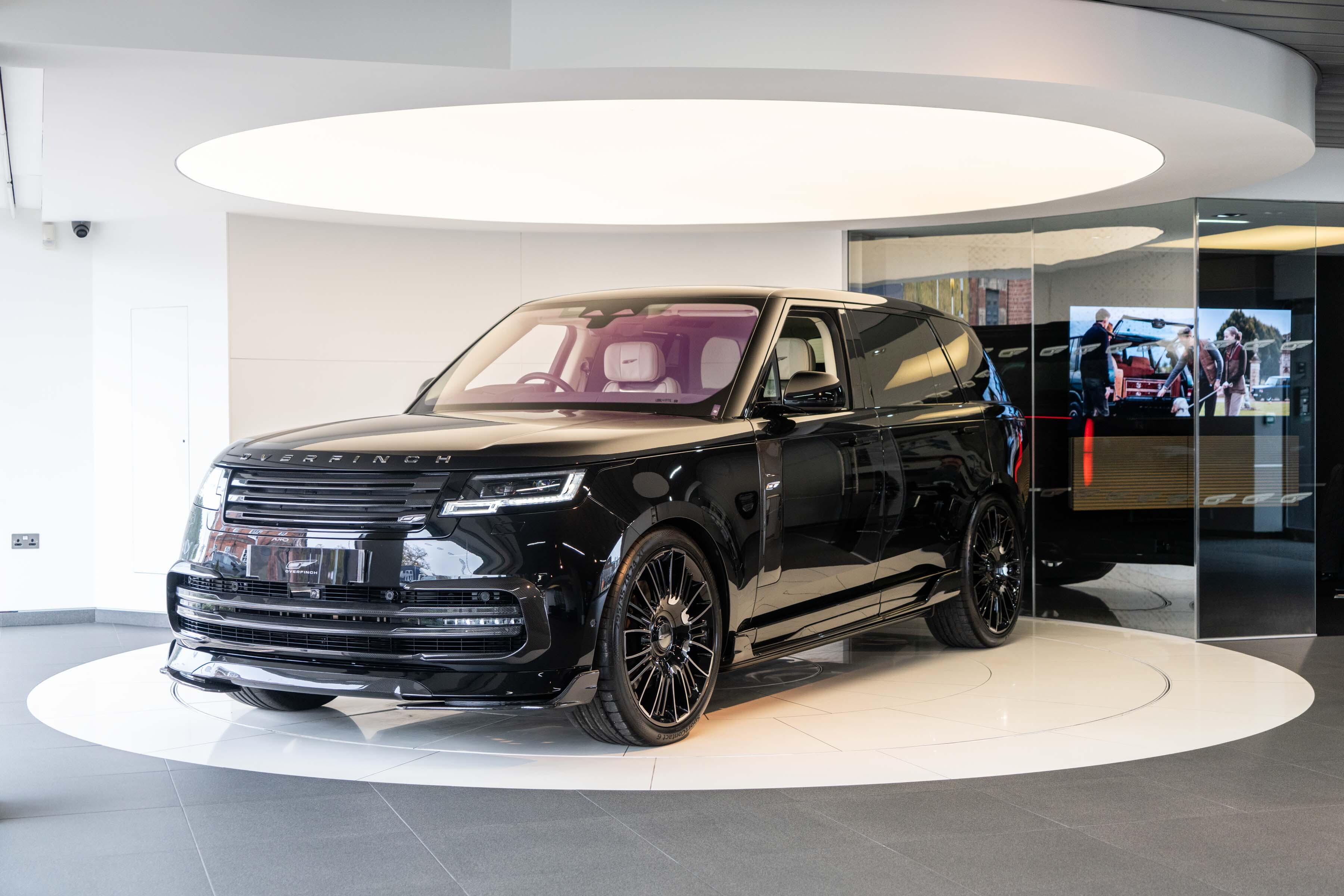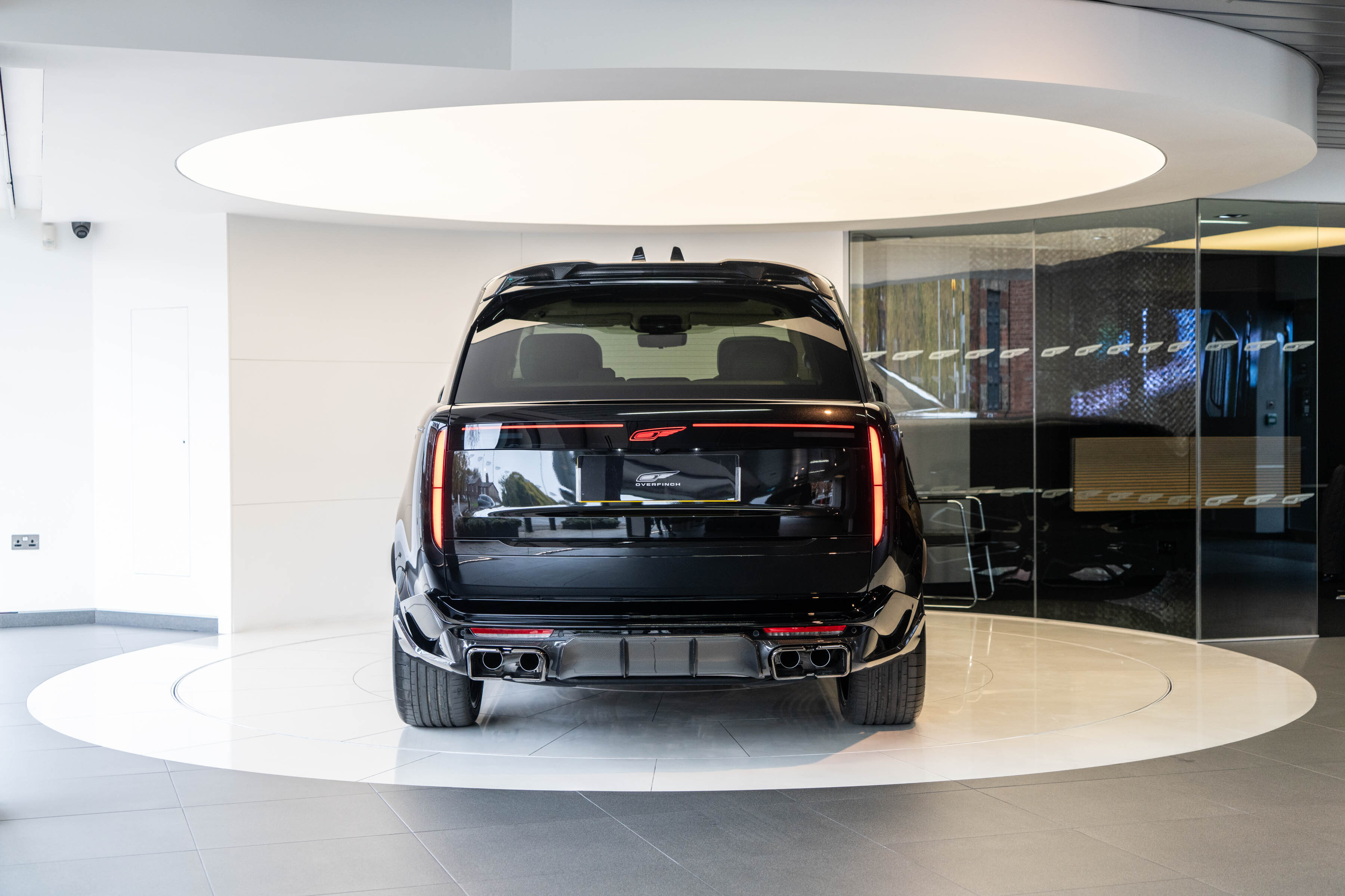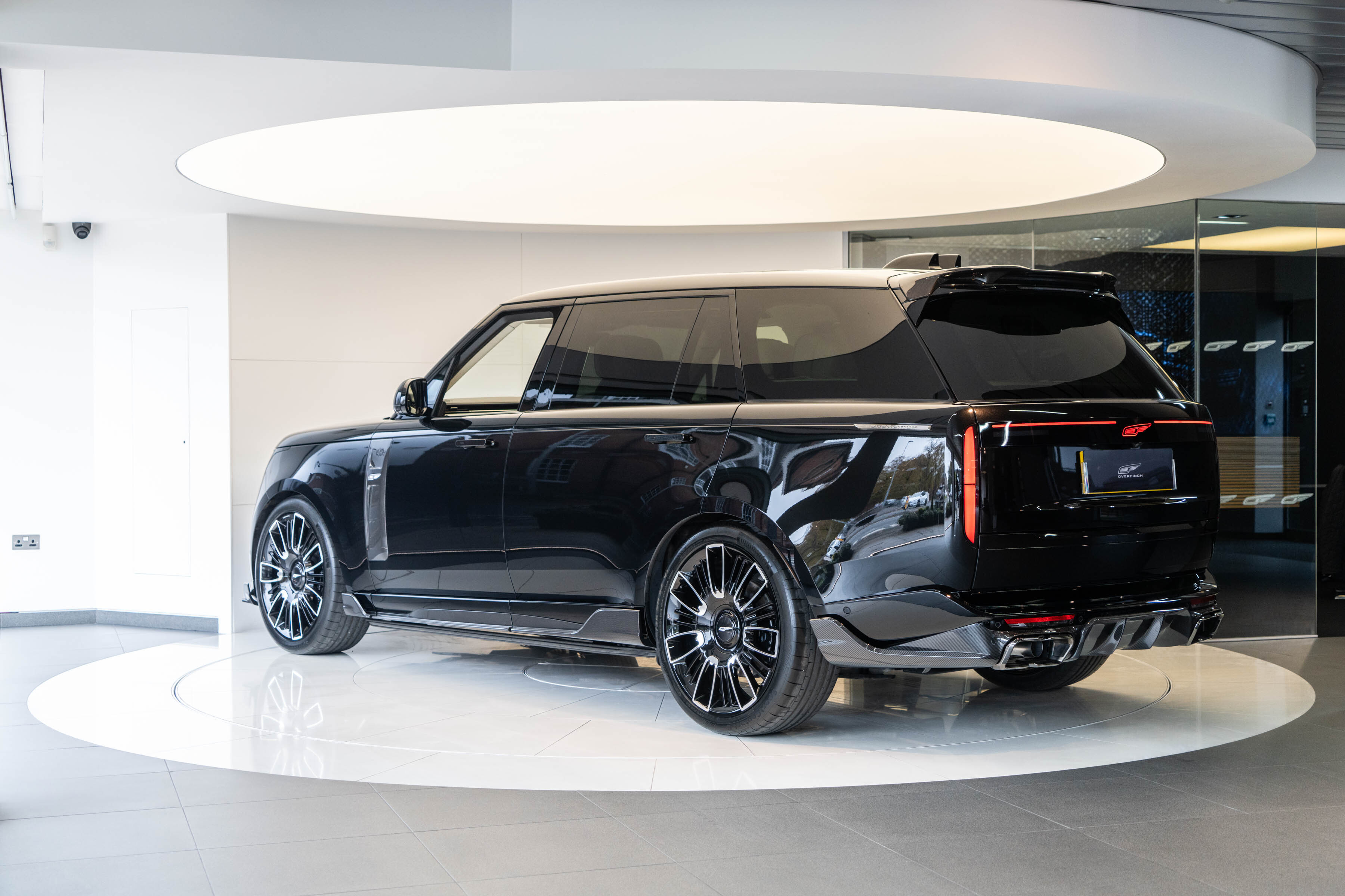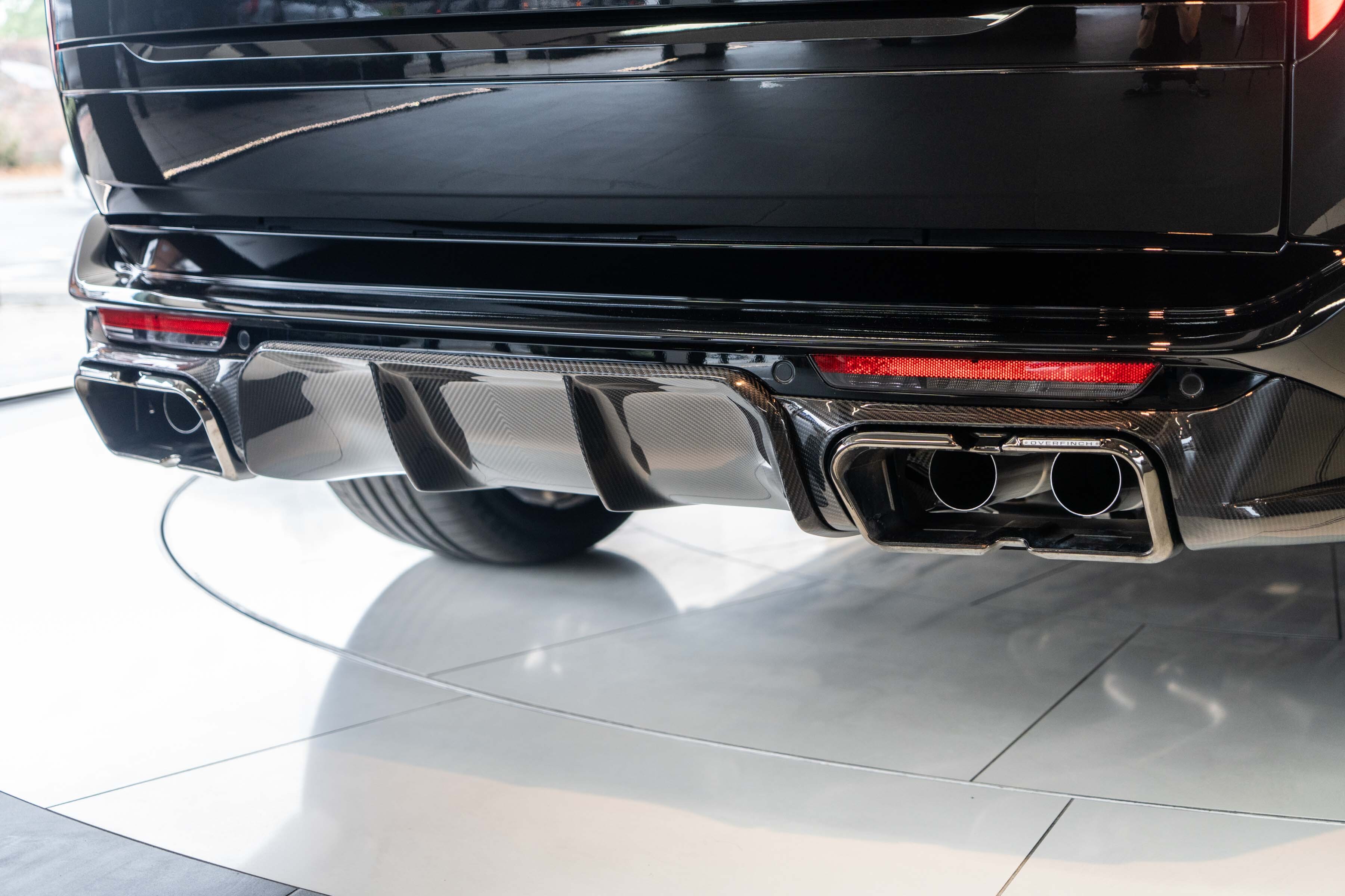 Overfinch Carbon Fibre Body Styling Package Comprising of Front Bumper Eyebrow Set with Visual Carbon Fibre Splitter and Side Wing Set, Integrated Carbon Fibre Bumper Insert, 6 Piece Visual Carbon Fibre Side Skirt Set, Visual Herringbone Carbon Fibre Diffuser with Cast Overfinch Engraved Exhaust Tips, Visual Carbon Fibre Roof Spoiler and Signature Rear Light Plinth with Illuminated Blade Badging