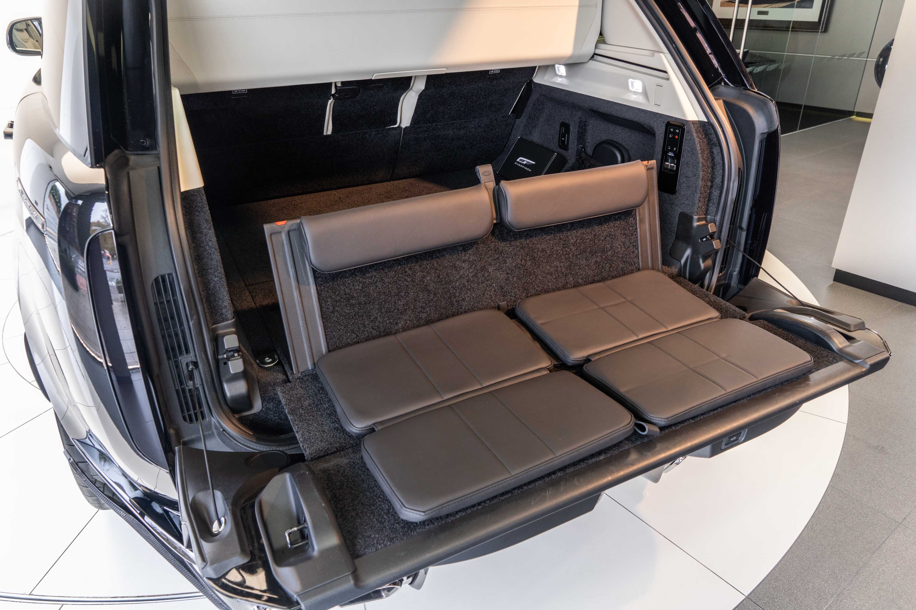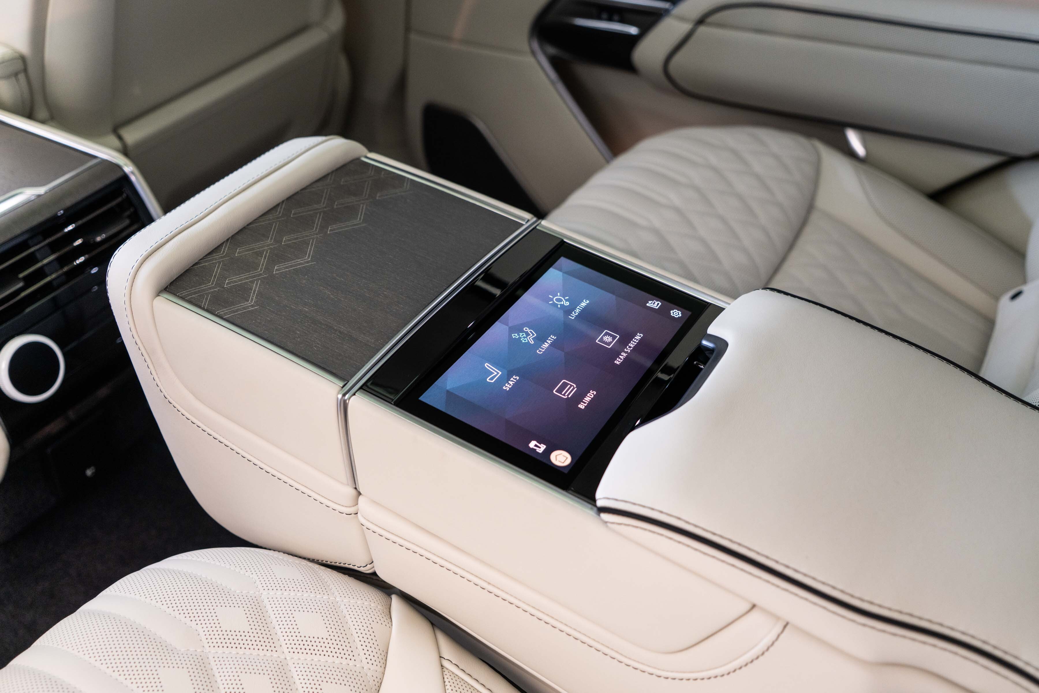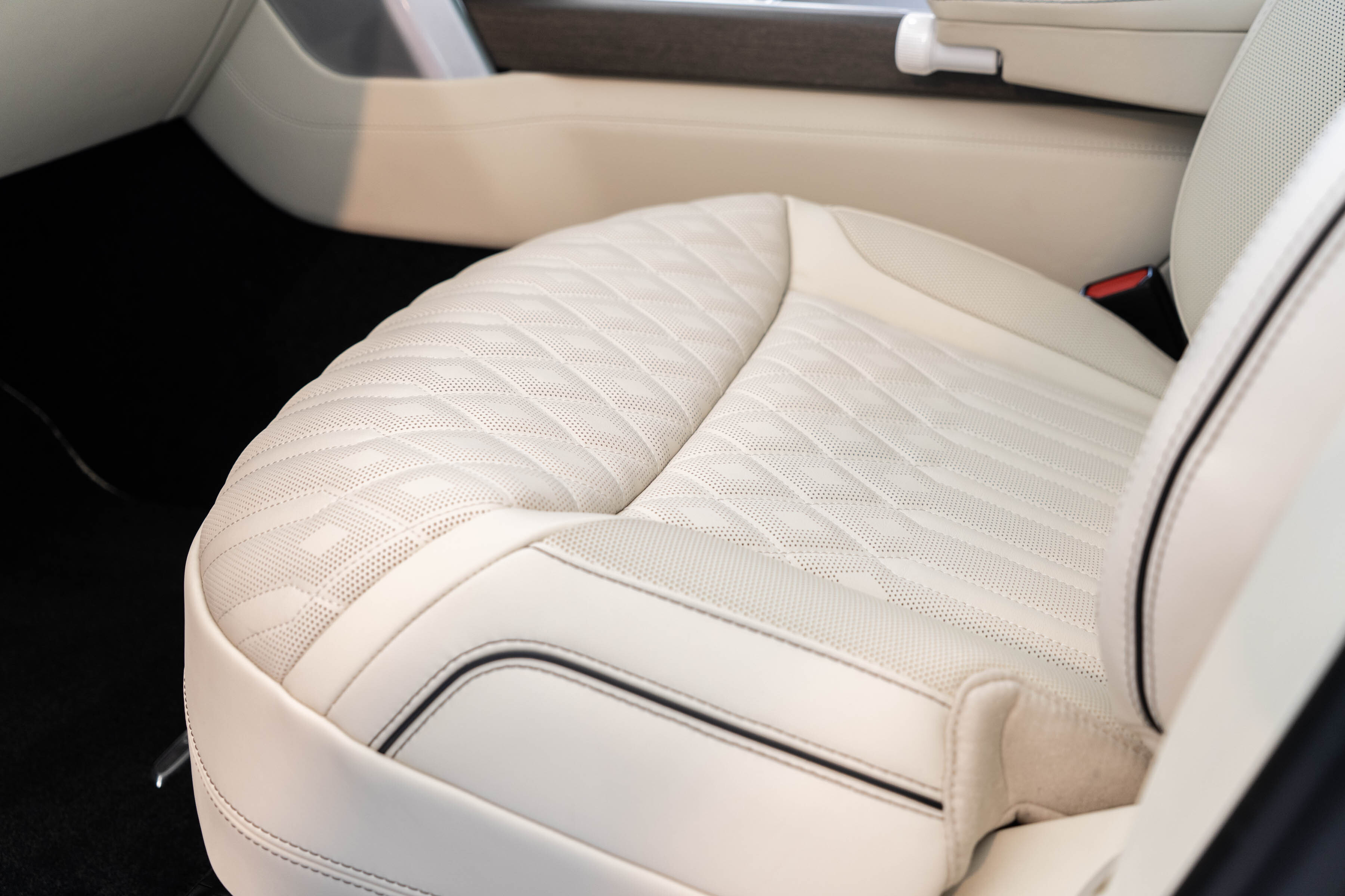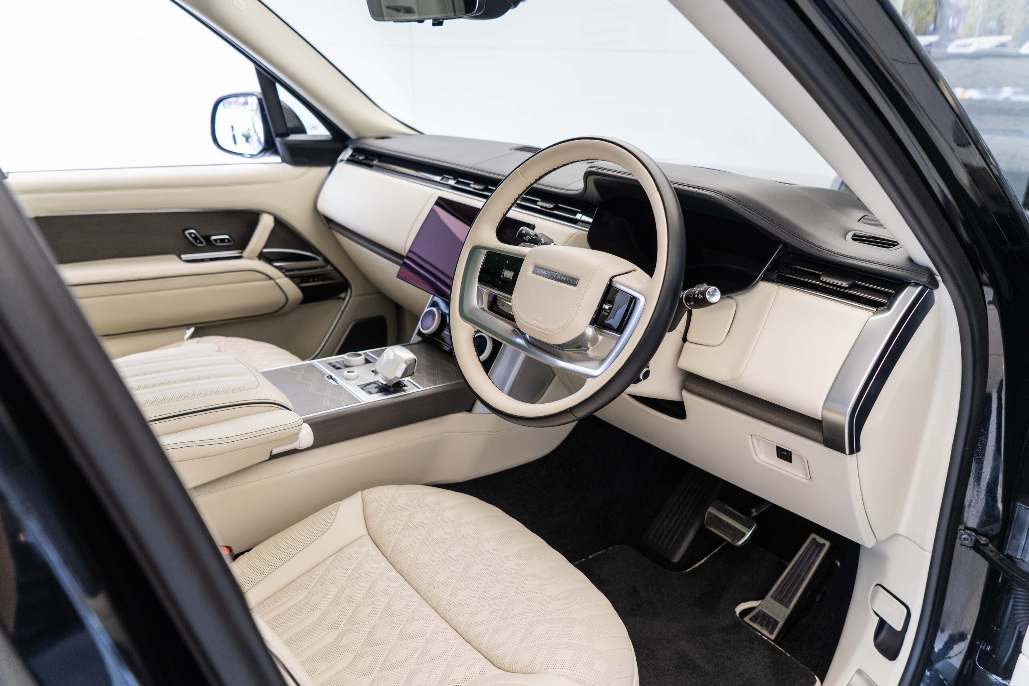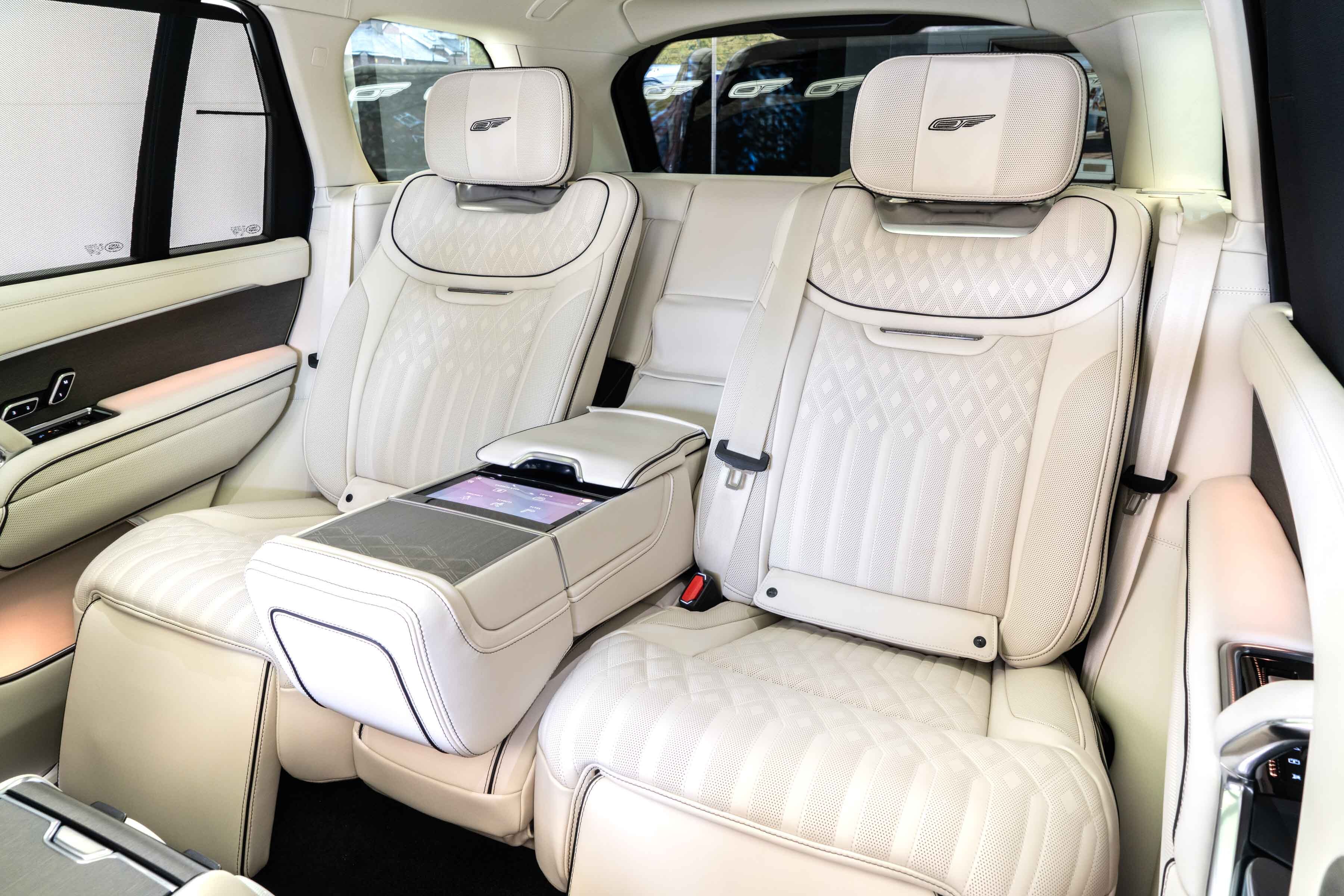 Overfinch Aurora Diamond Quilted Leather Interior Comprising of Seats, Cubby Box Lid and Door Arm Rests Trimmed in Bridge of Weir Premium Ebony Leather, Contrast Perlino Micropiping and Stitching