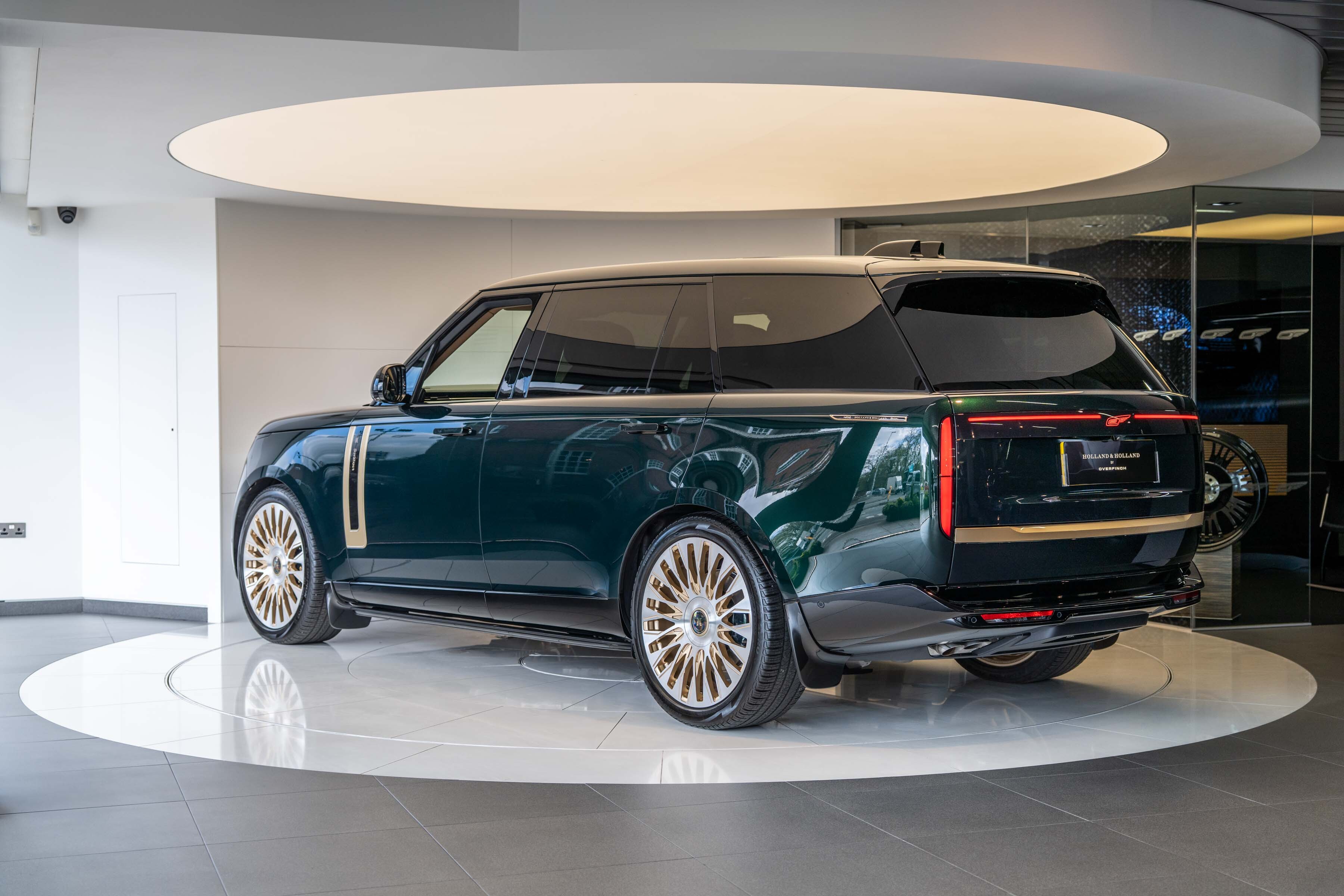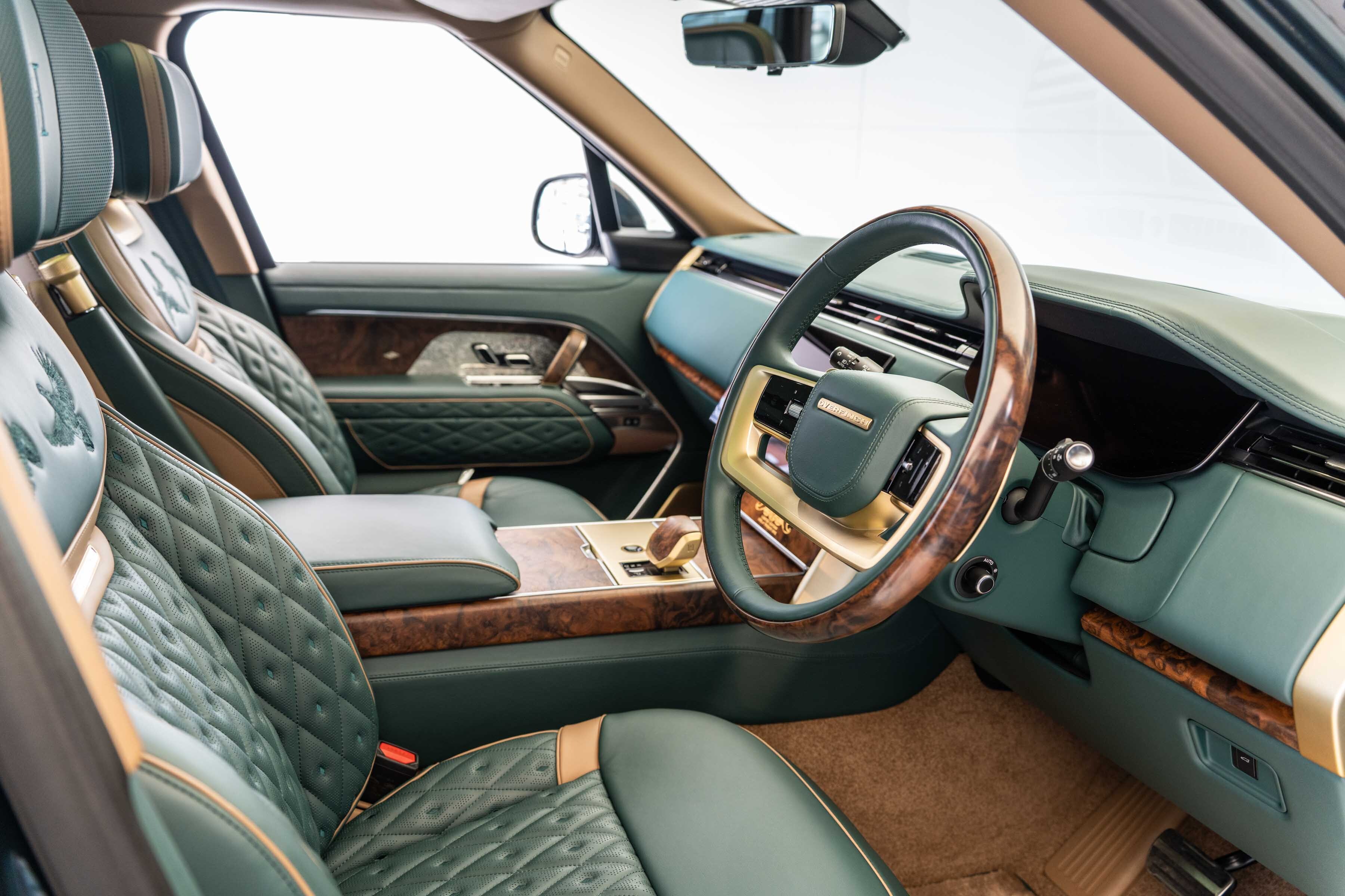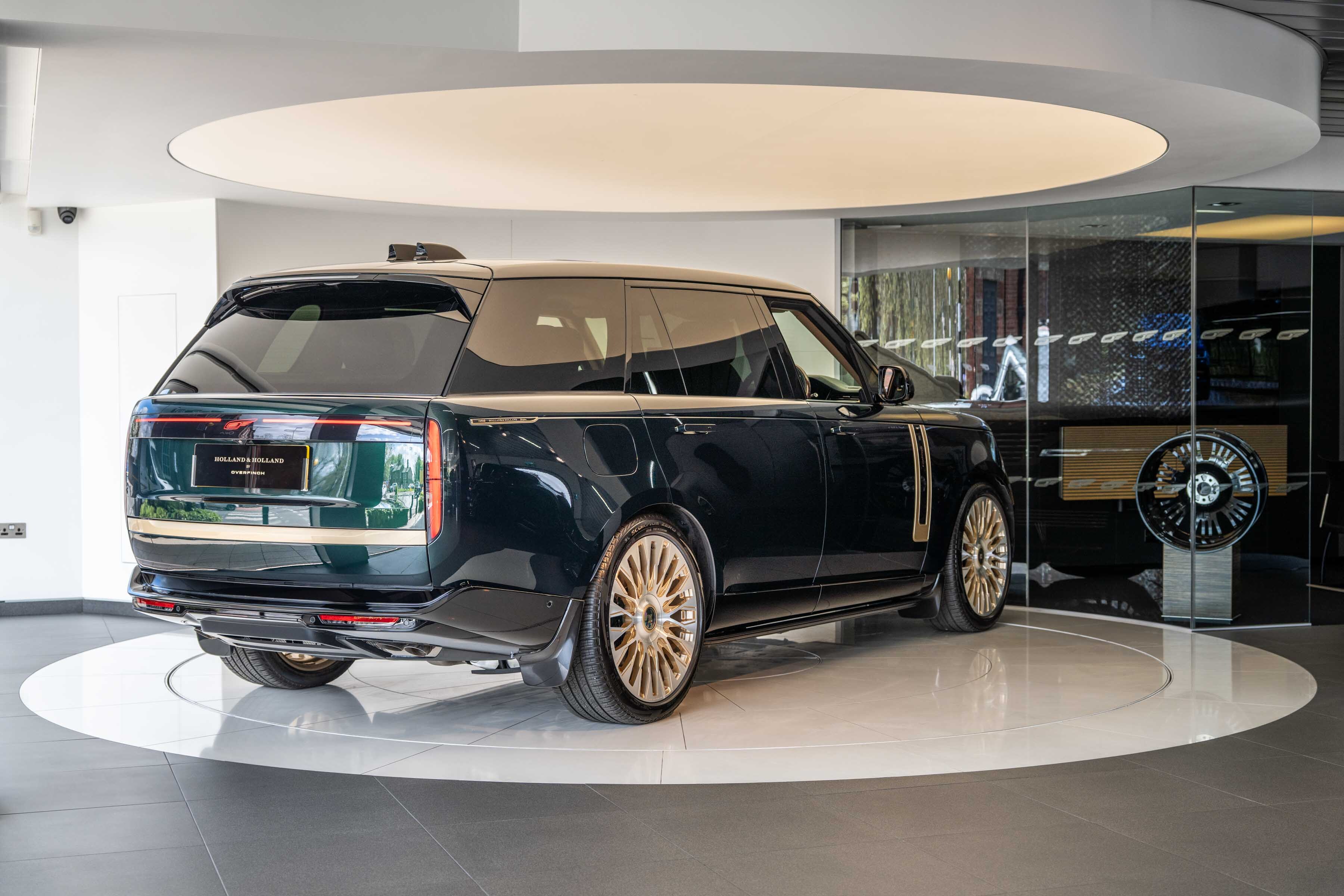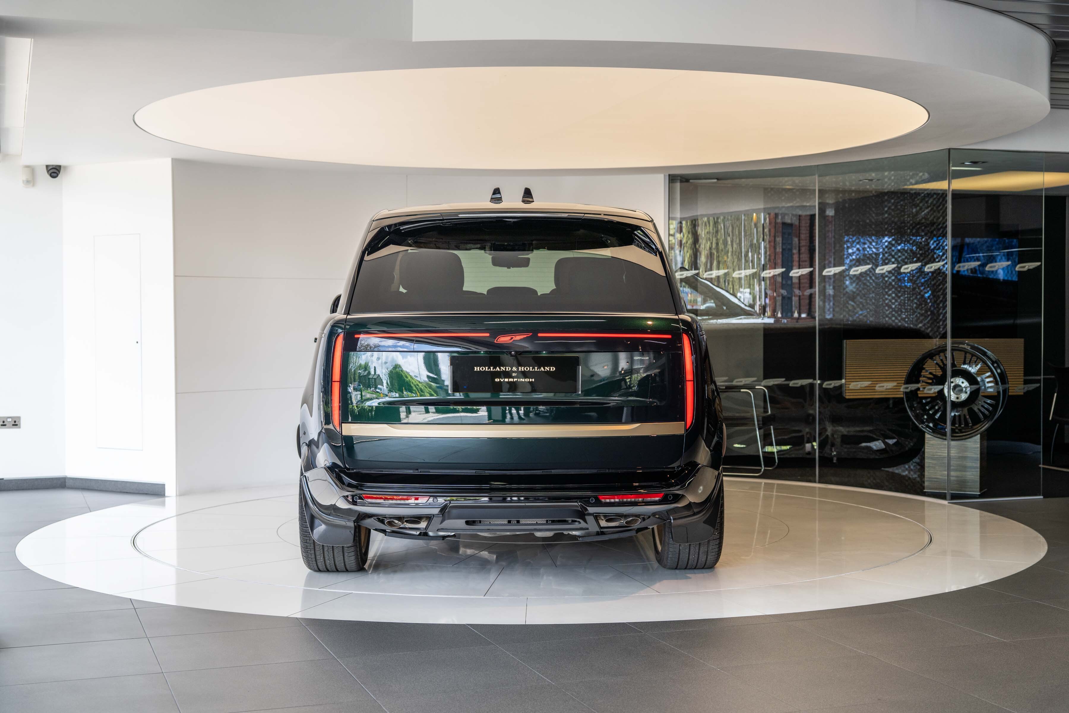 Holland & Holland’s insignia is elegantly placed on a machined dual finish grille; intricate louvres and decorative surround anchor a bold front profile complemented by Overfinch’s bespoke bonnet script lettering and a matching lower grille.