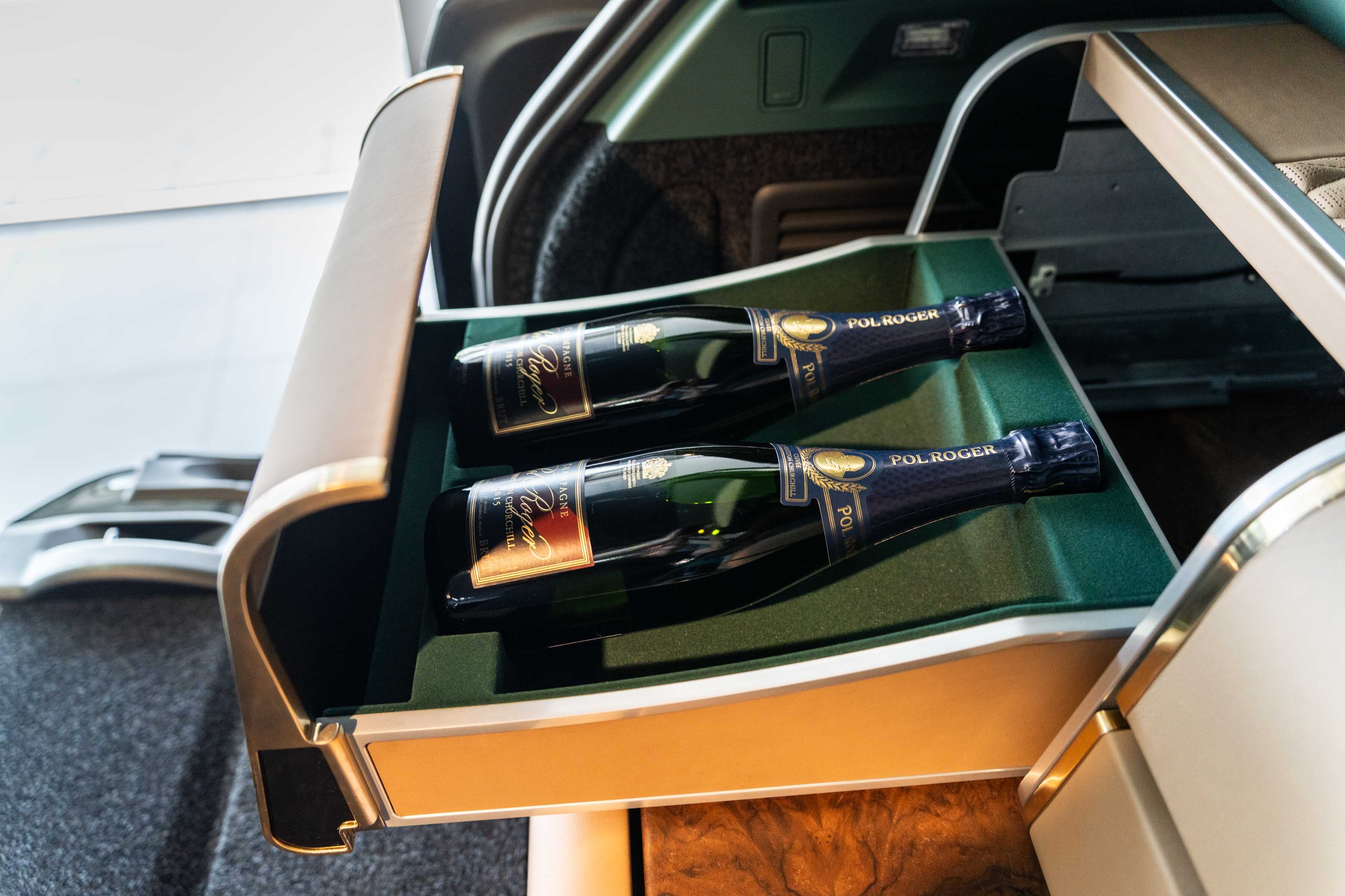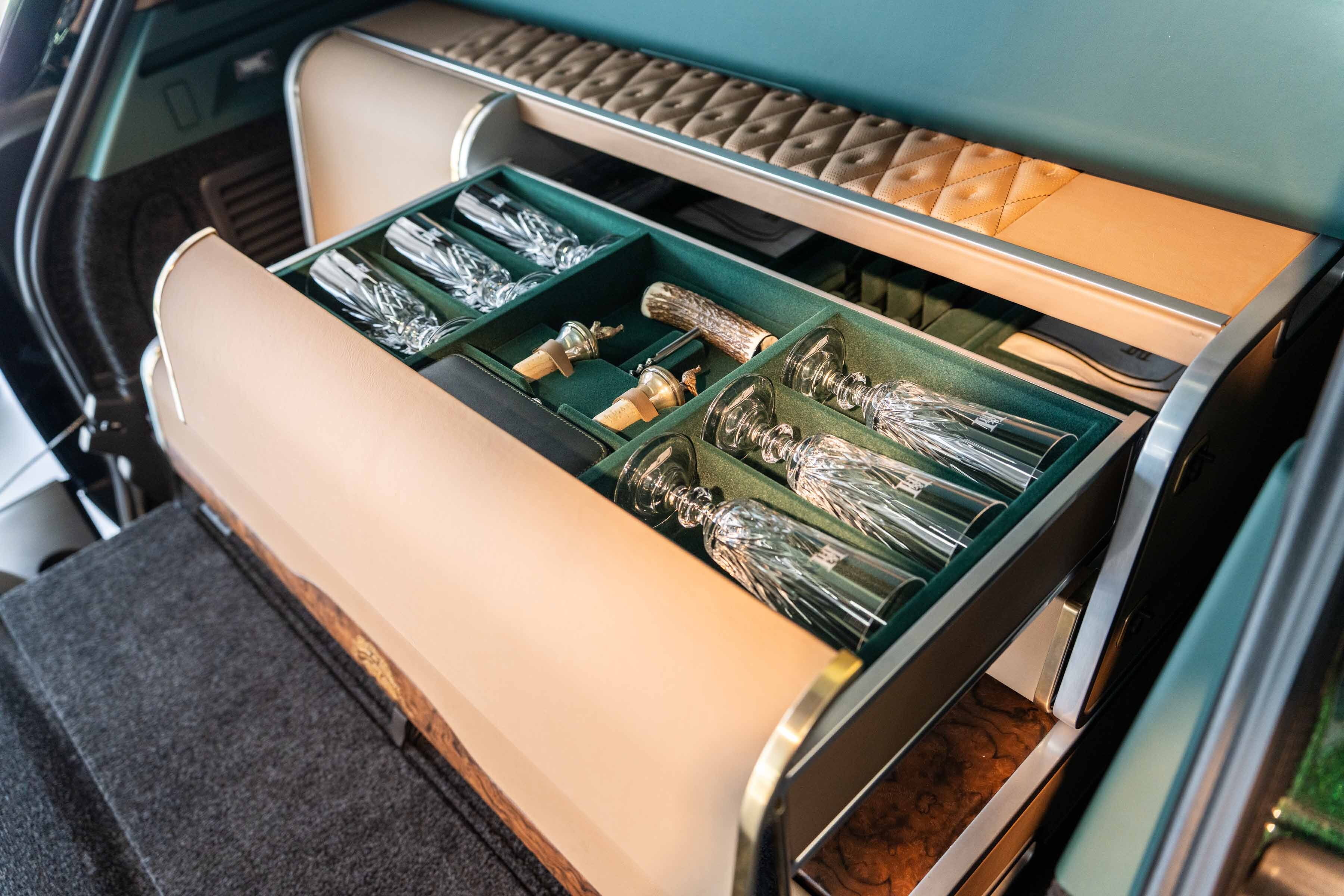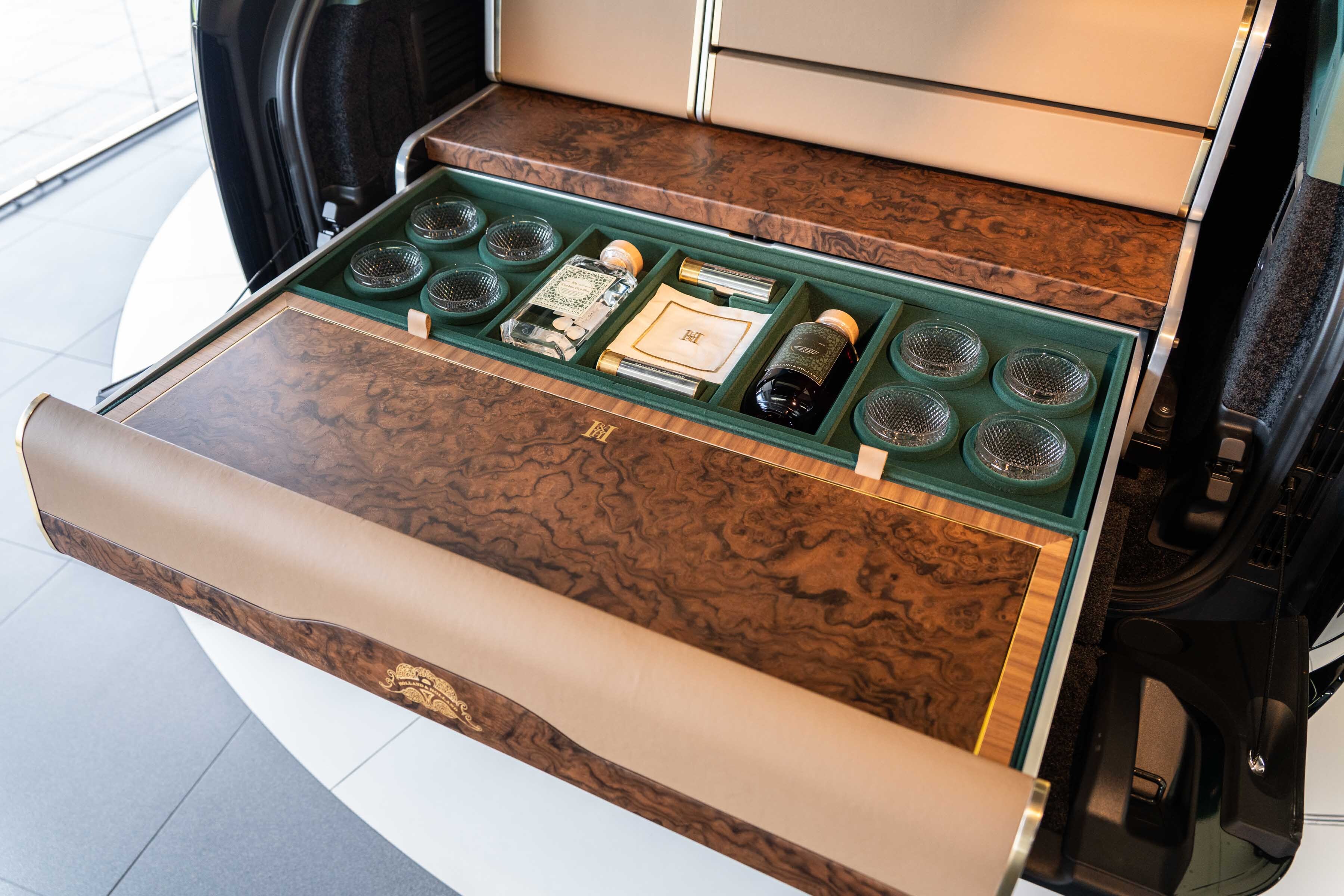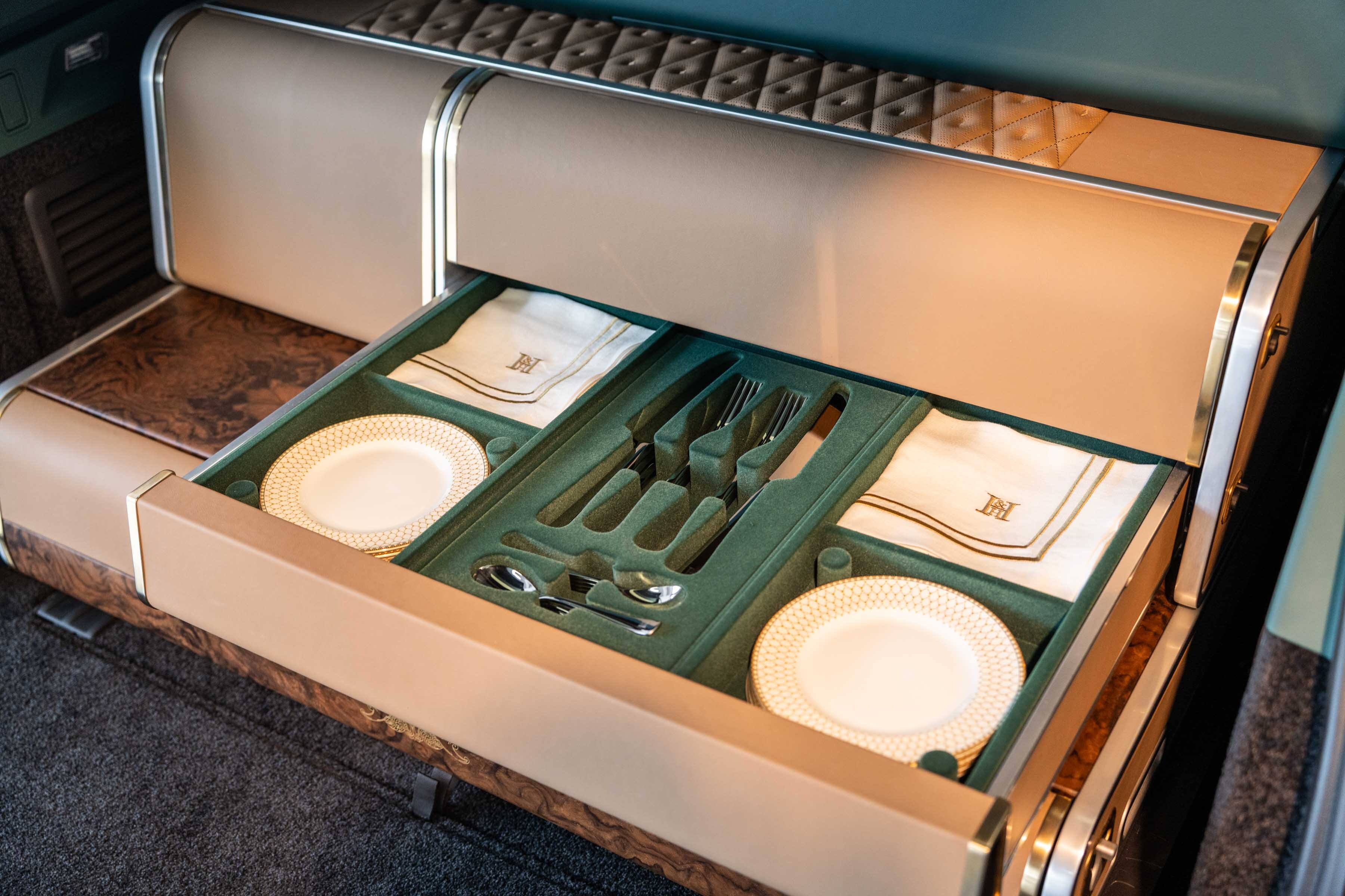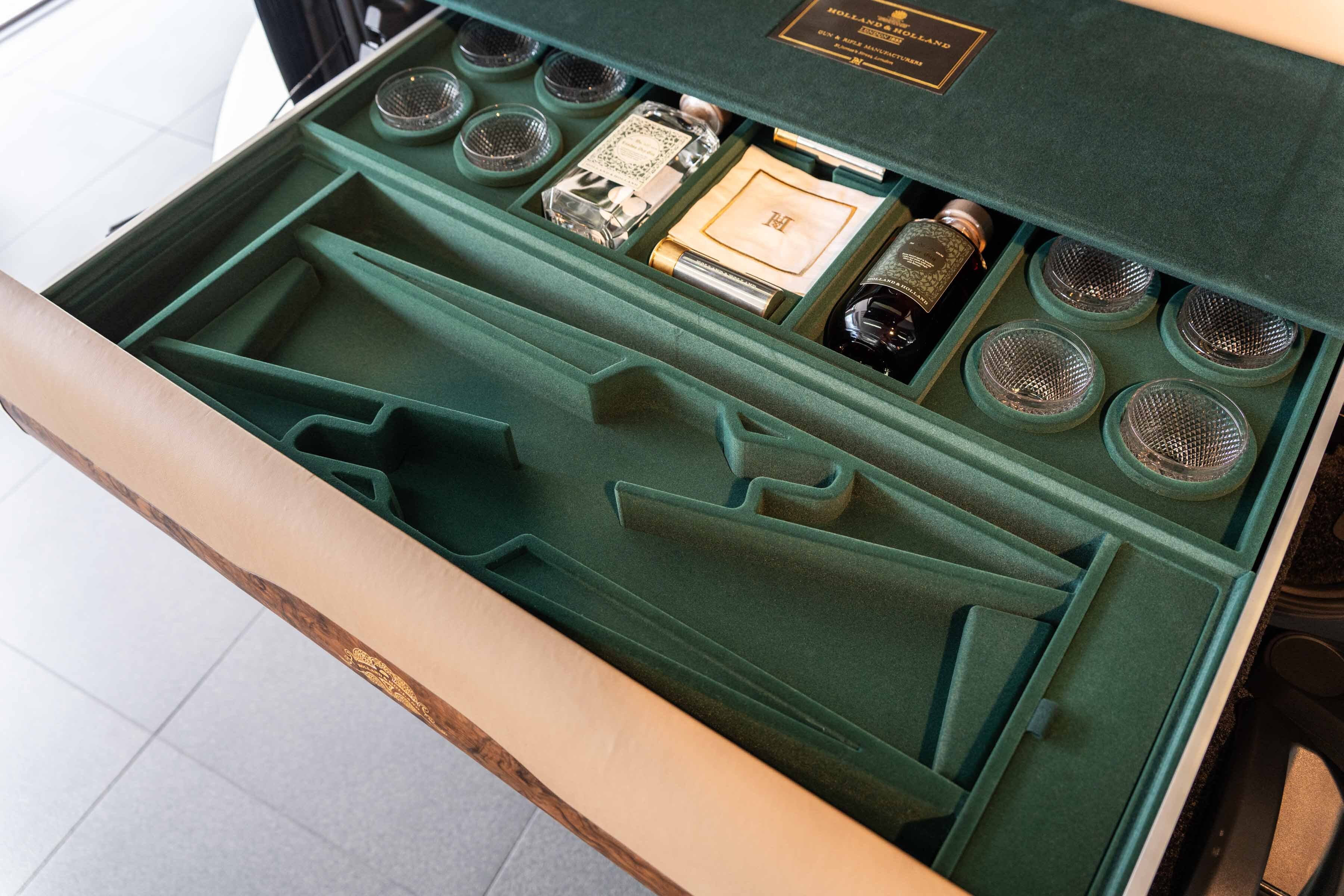 The upper chest’s left-hand drawer offers safe stowage for two champagne bottles, while on the right, twin drawers house an extensive array of Holland & Holland accessories. Perfectly appointed for parties of eight, fine-cut crystal champagne flutes accompany a staghorn corkscrew, two silver bottle stoppers, fine crockery, H&H monogrammed napkins and a complete cutlery set.