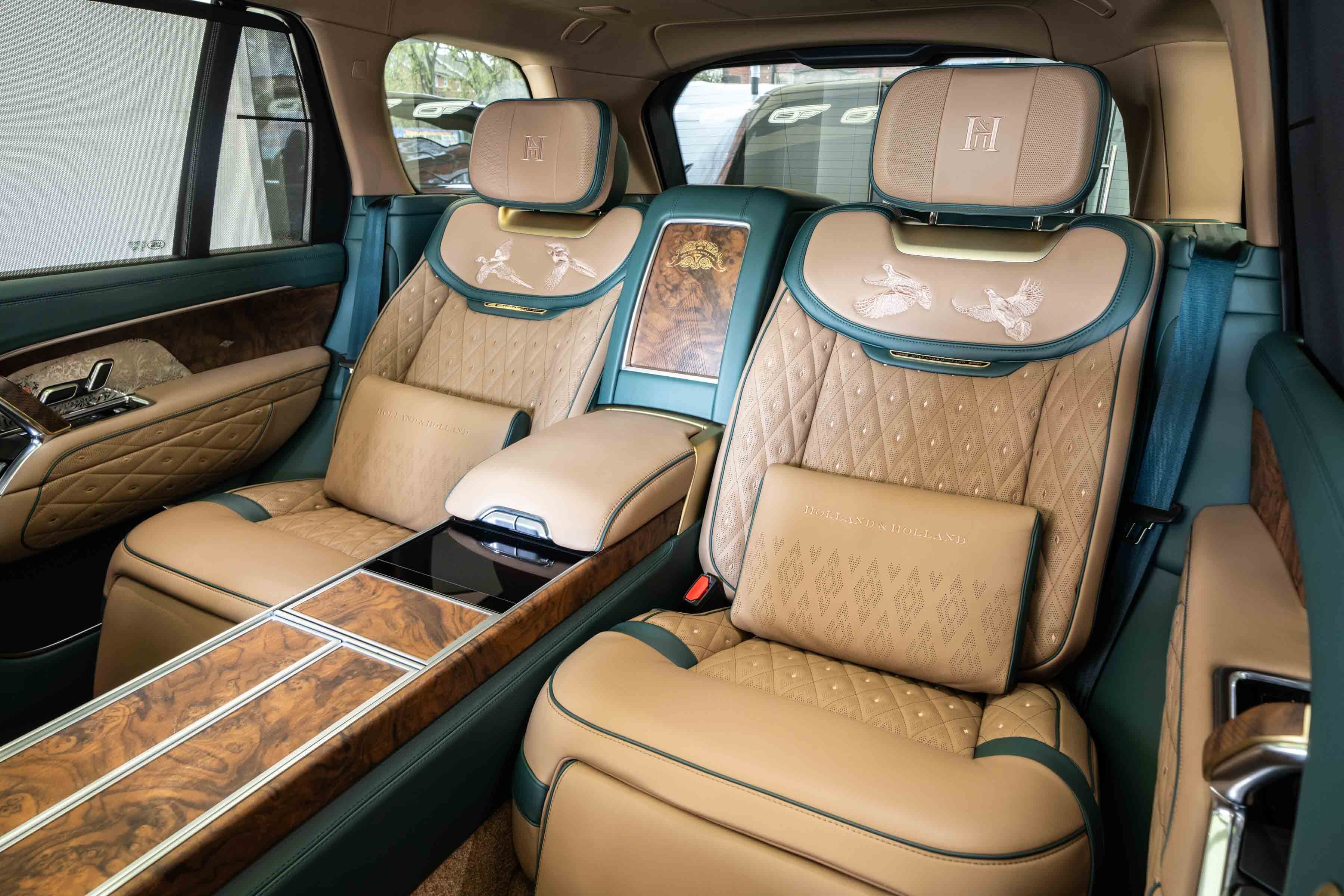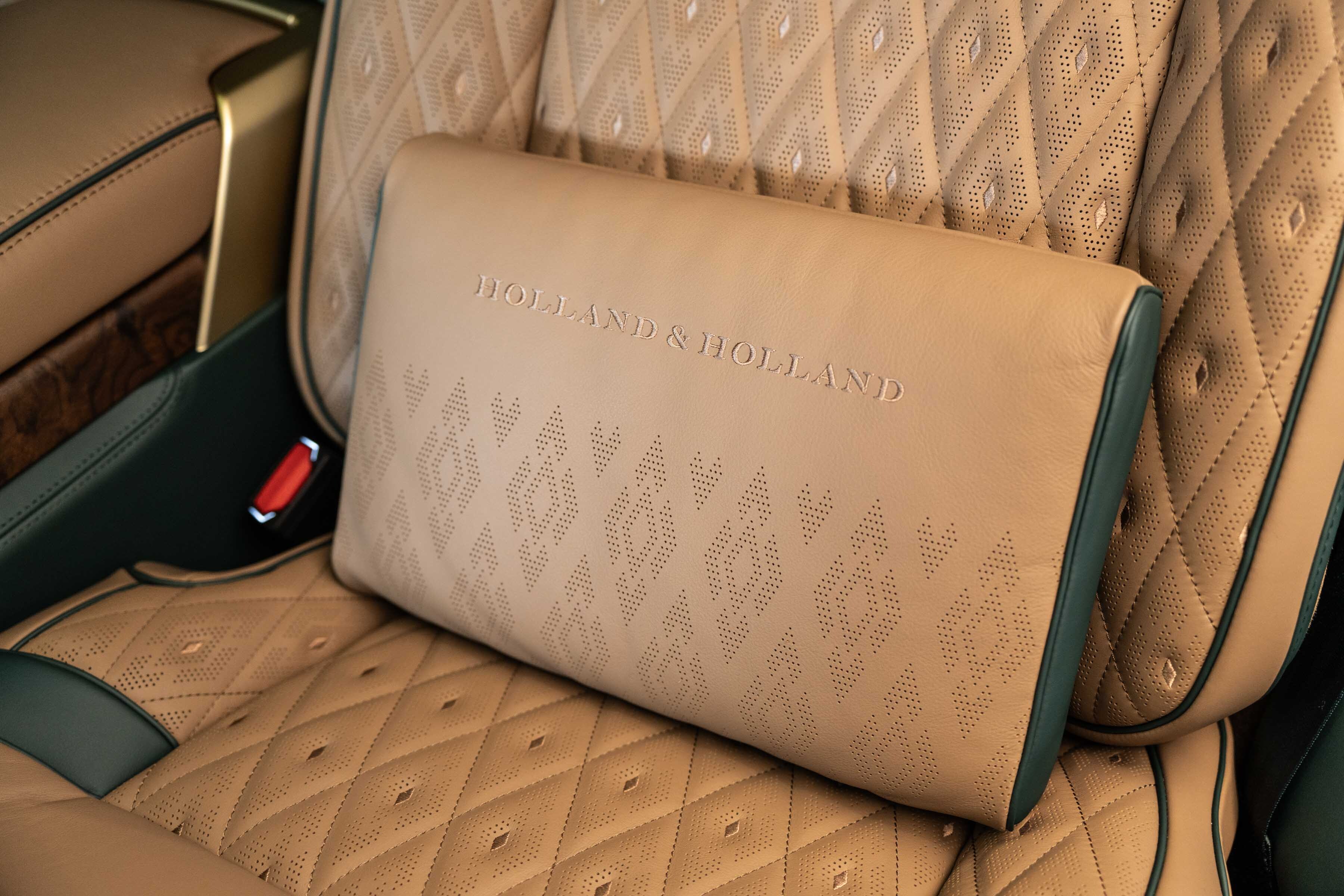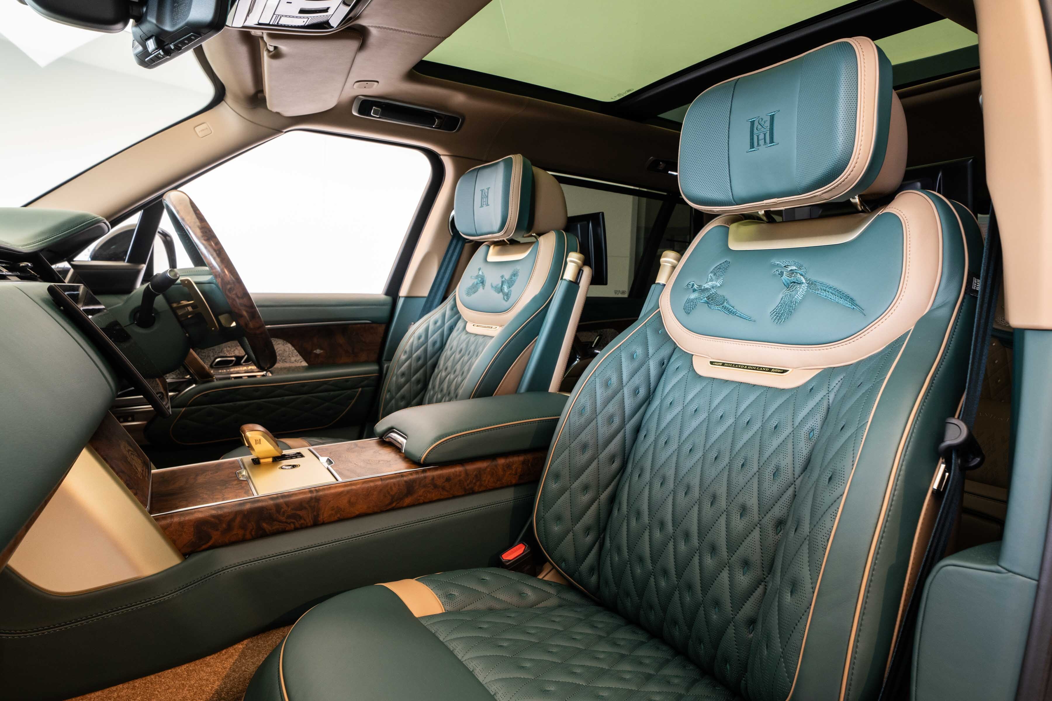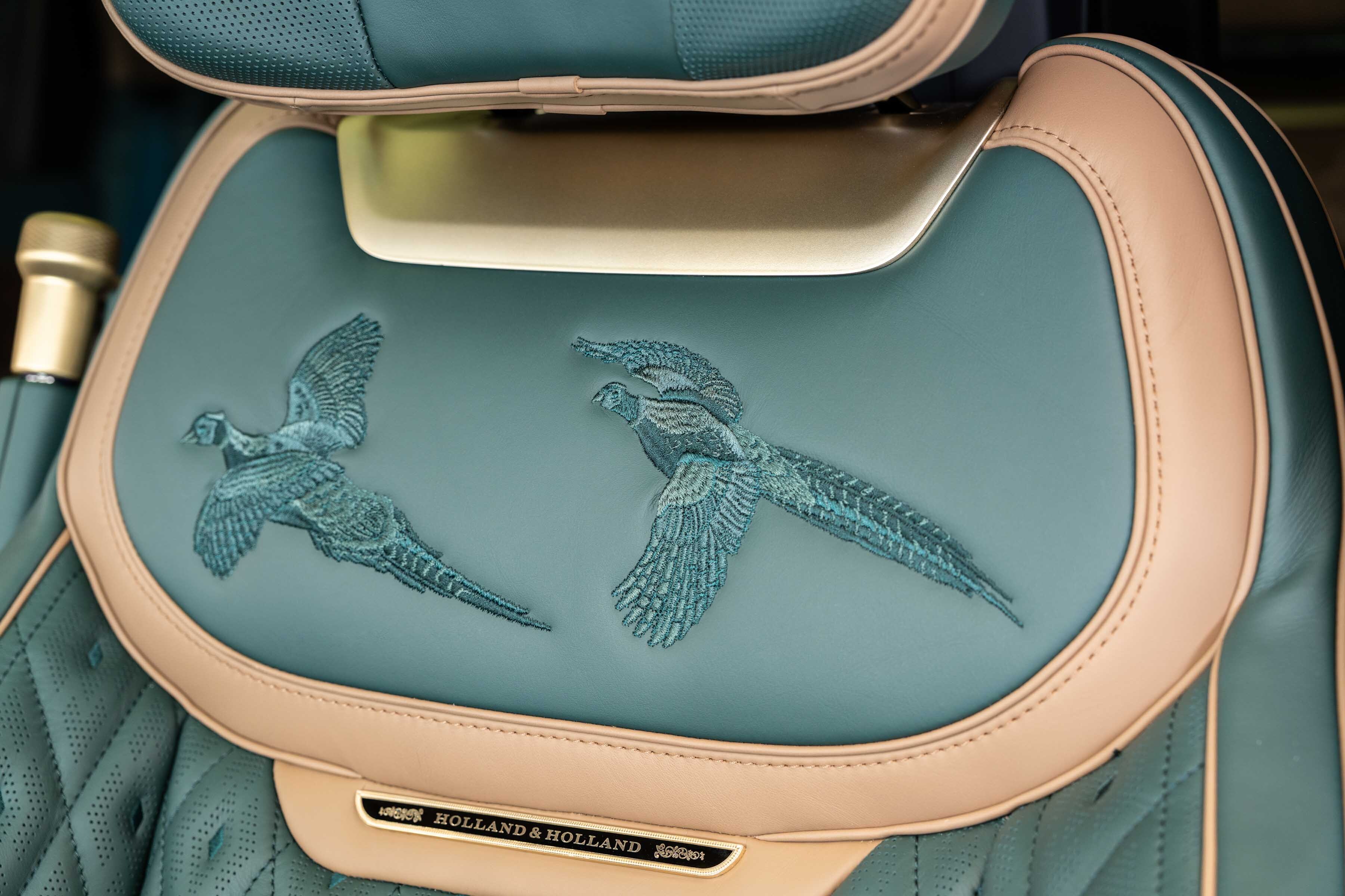 Quilted Bridge of Weir leather with contrast micro piping and stitching lines the monogrammed seats, each adorned with Holland & Holland enamel badging and intricately embroidered sporting scenes.