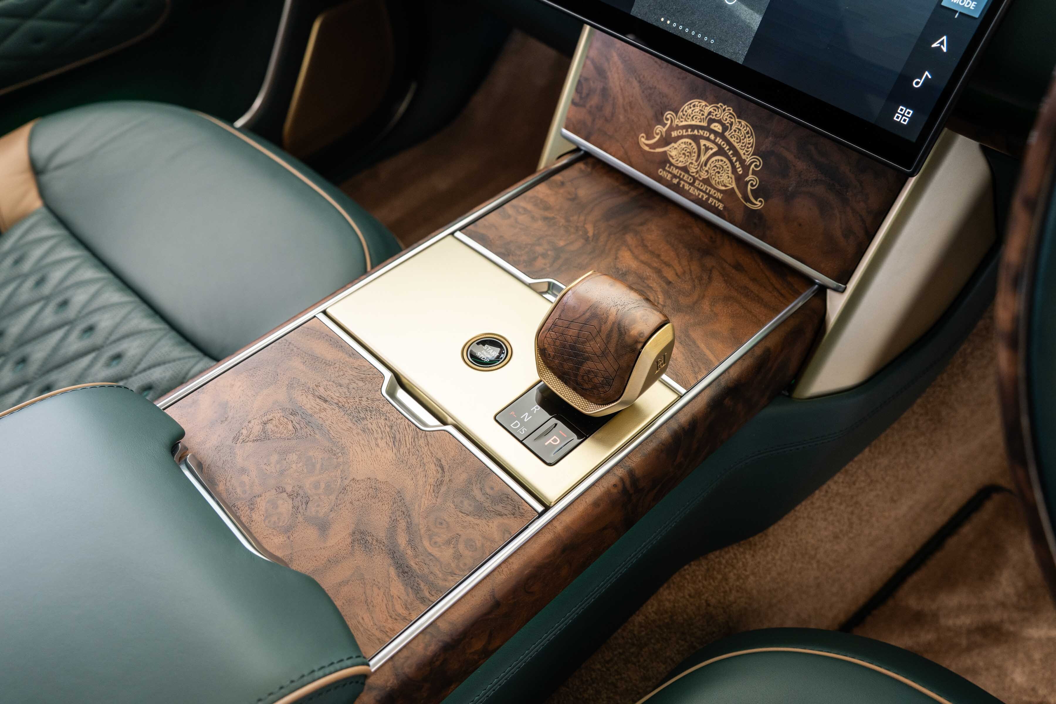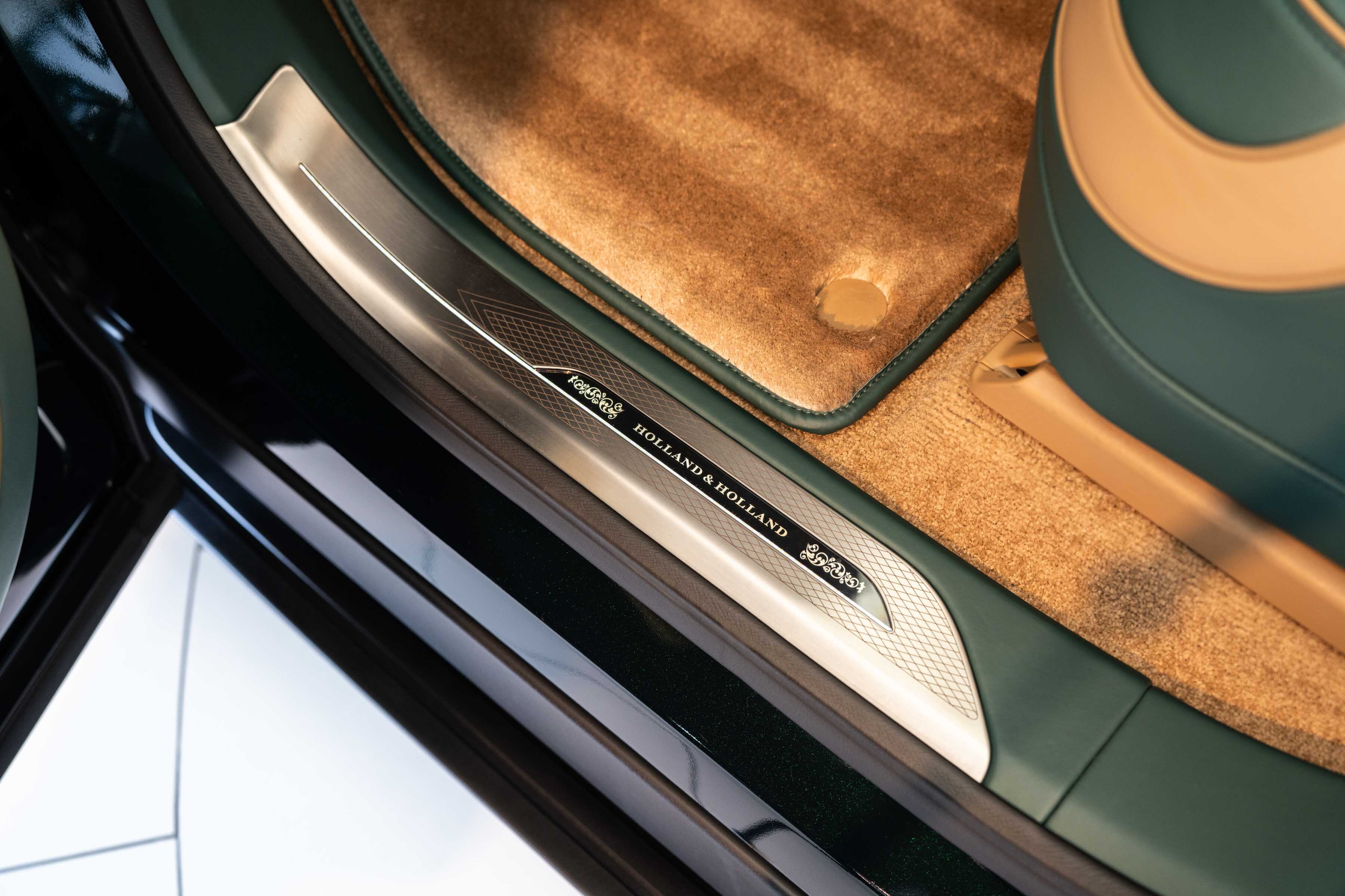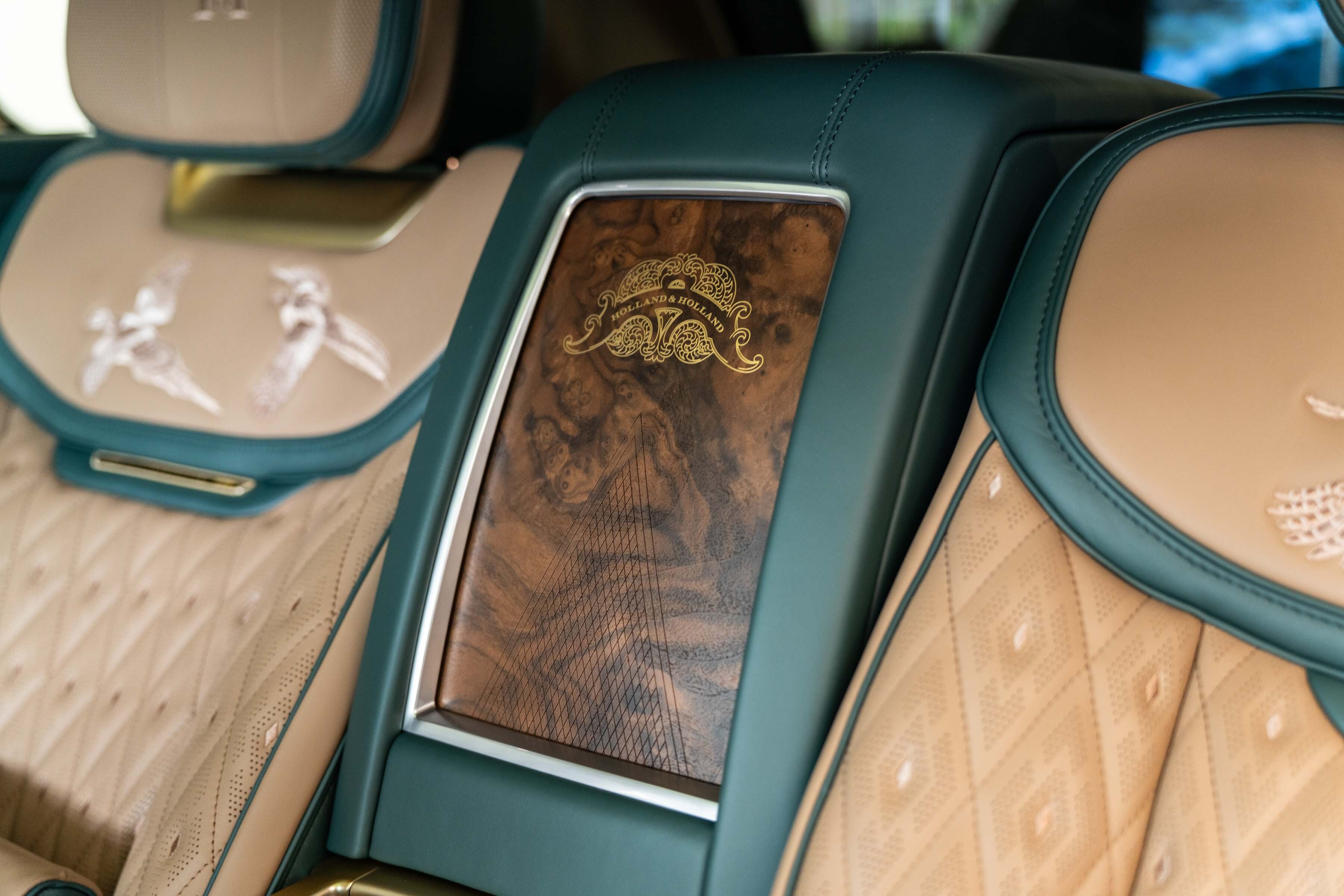 Quilted Bridge of Weir leather with contrast micro piping and stitching lines the monogrammed seats, each adorned with Holland & Holland enamel badging and intricately embroidered sporting scenes.