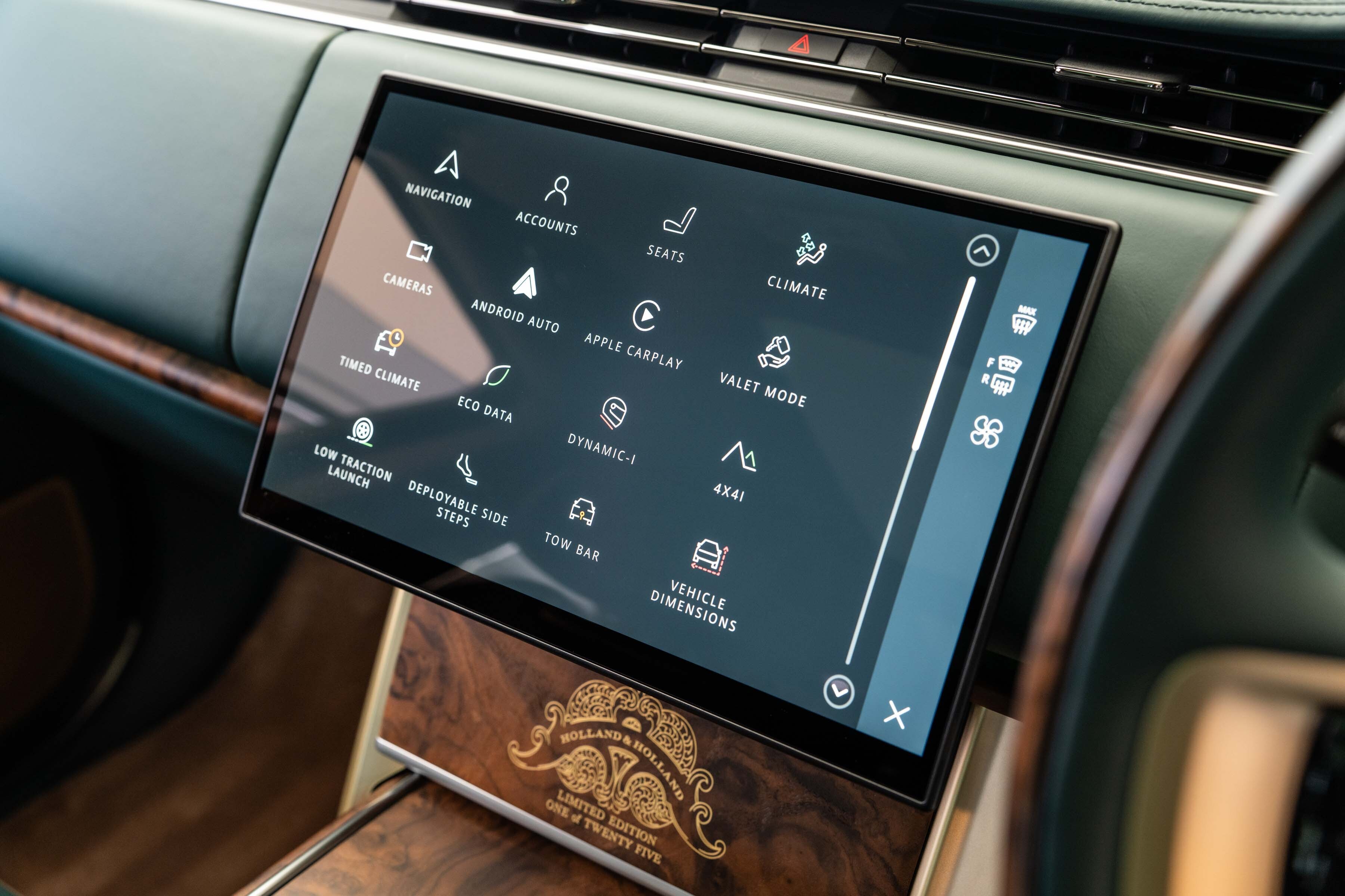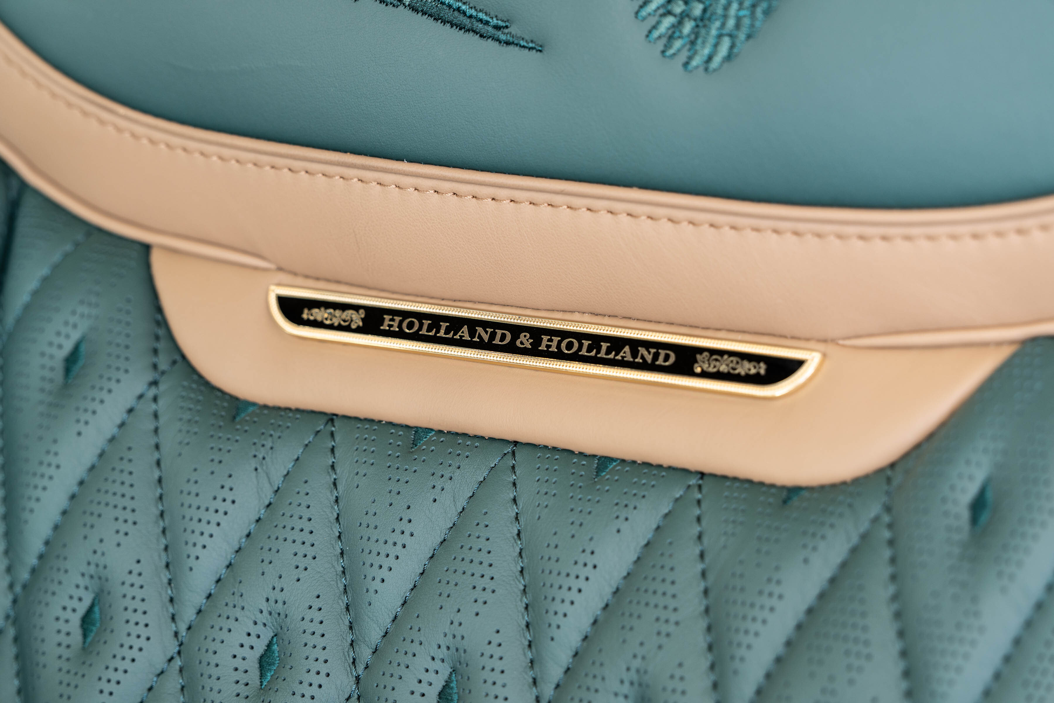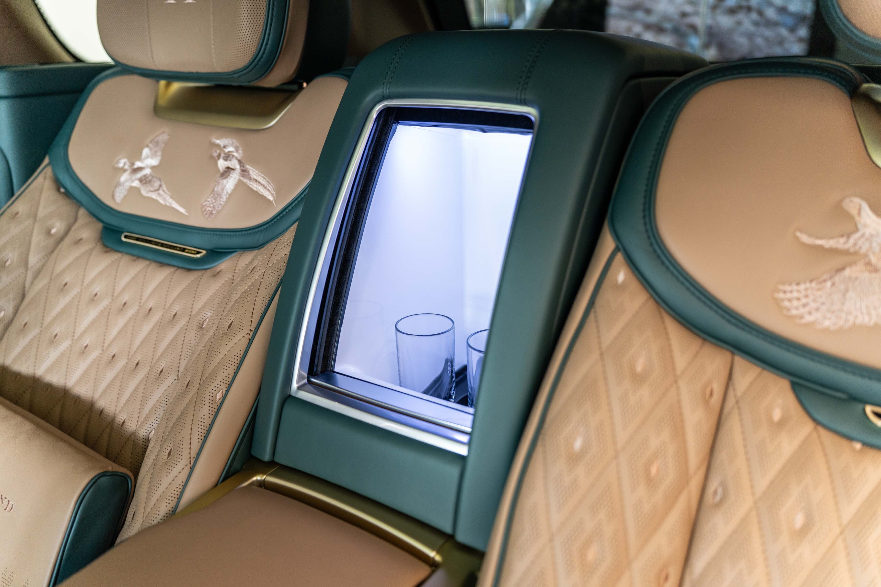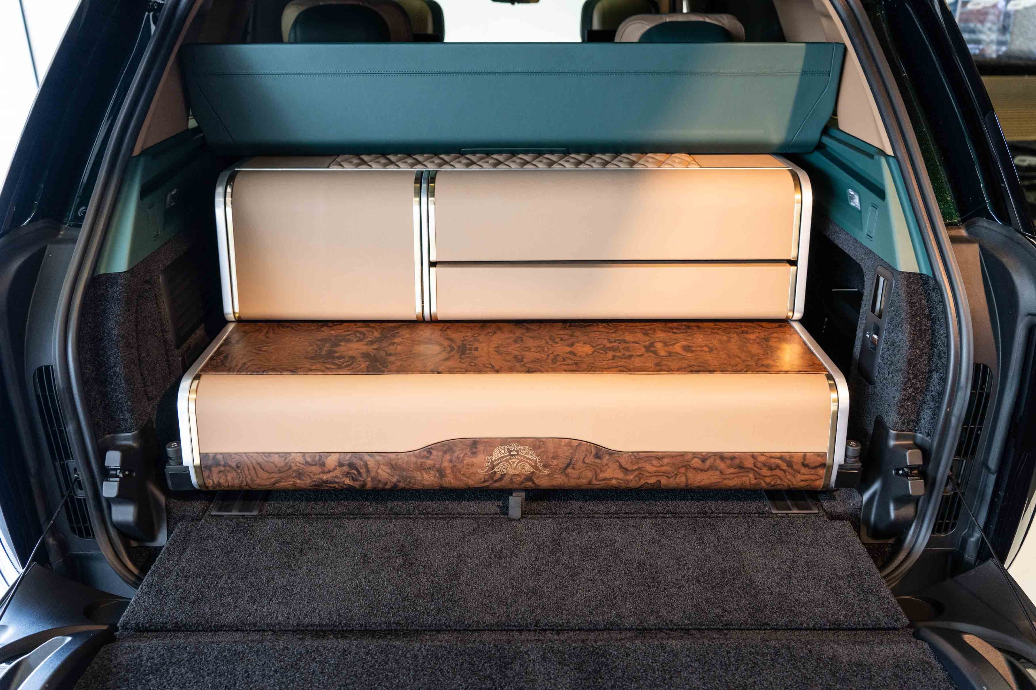 Quilted Bridge of Weir leather with contrast micro piping and stitching lines the monogrammed seats, each adorned with Holland & Holland enamel badging and intricately embroidered sporting scenes.