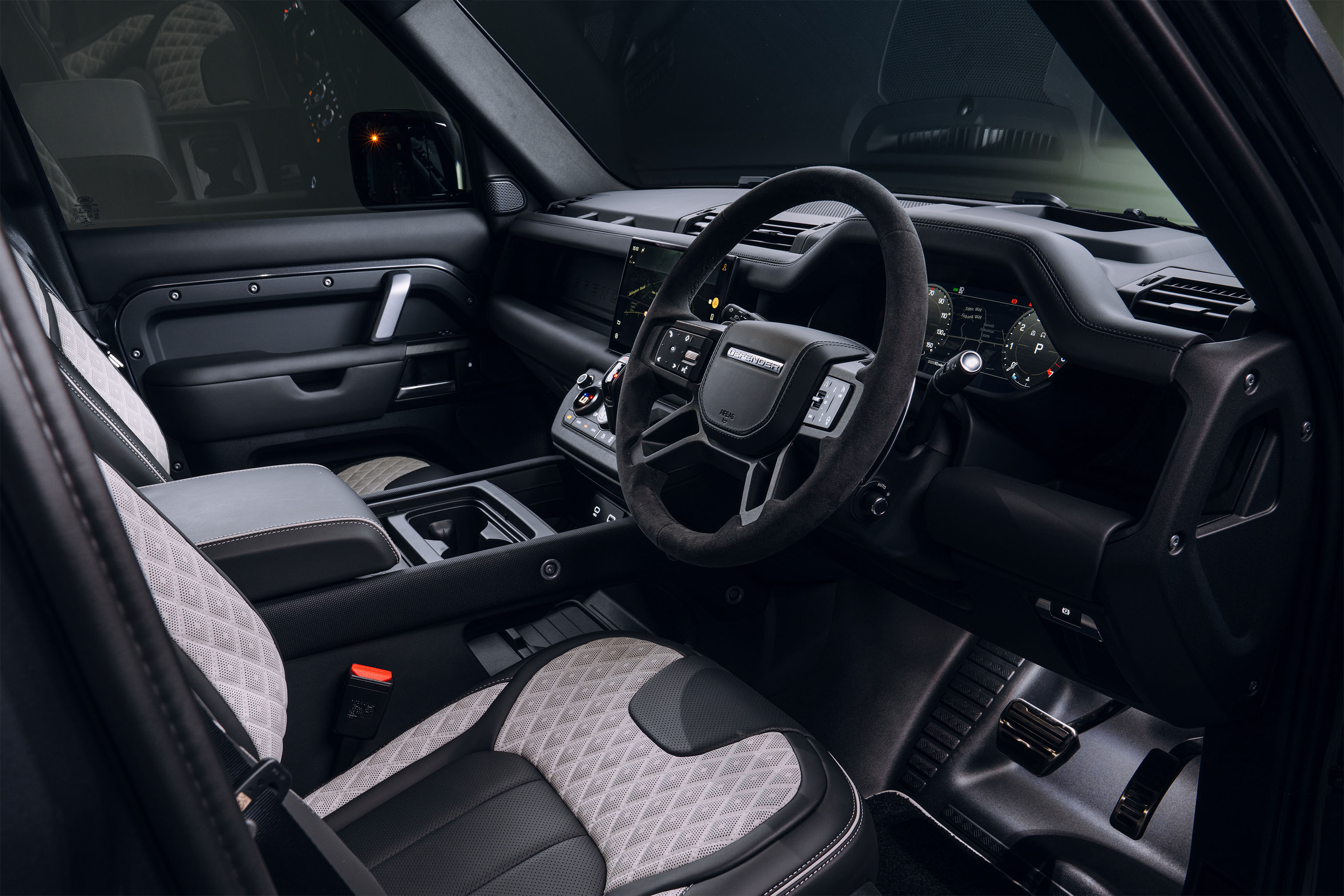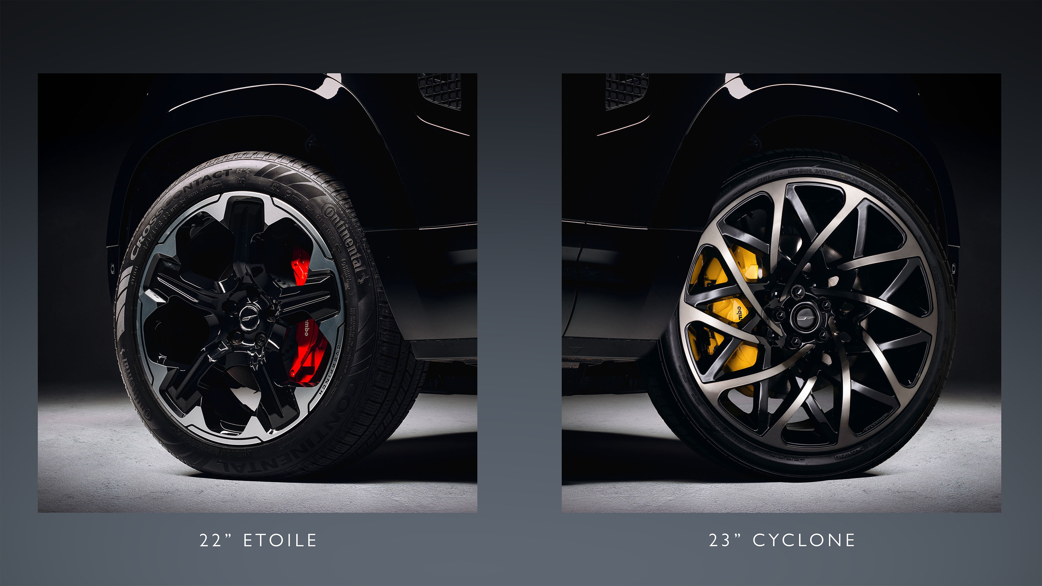 Designed specially for the Defender, the 22" Étoile wheels provide ultimate ride quality for off road pursuits. If appearance is president, the popular and striking 23" Cyclone wheels can also be fitted. Both Overfinch options are TÜV approved and are available in full gloss black, gloss black with a diamond-turned face and shadow chrome.